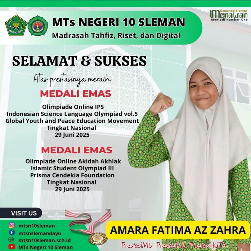 Kemenag Sleman News (MTsN 10 Sleman) —Amara Fatimah Az-Zahra. Siswi kelas 9B, kelas Tahfiz MTsN 10 Sleman menunjukkan hasil belajar dengan prestasi berbagai kompetisi olimpiade tingkat nasional. Sejak duduk di bangku kelas 8 , Amara telah mengoleksi medali emas, perak, dan perunggu dari berbagai bidang olimpiade matapelajaran secara online.