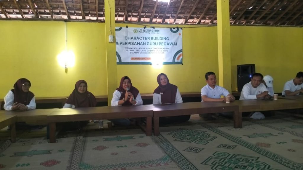Kemenag Sleman News (Sleman) – MTsN 9 Sleman menyelenggarakan kegiatan Character Building yang dirangkai dengan acara perpisahan guru dan pegawai mutasi maupun purna tugas pada Minggu (18/8/2025) bertempat di Rumah Makan Griyowono, Gunungkidul. Acara yang dimulai pukul 10.00 WIB ini berlangsung penuh kehangatan dan kekeluargaan. Kegiatan diawali dengan pembukaan oleh MC, Dwi Ari Wahyuni. Selanjutnya, acara diisi dengan sambutan dari Kepala MTsN 9 Sleman yakni Siti Juwariyah dilanjutkan penyampaian kesan dan pesan dari guru serta pegawai yang telah mutasi dan purna tugas.