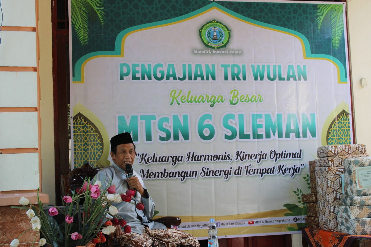 Kepala MTsN 6 Sleman, Jazim Kholis, dalam sambutannya menyebutkan bahwa acara ini merupakan momen “three in one”, karena memadukan tiga agenda sekaligus. “Hari ini kita berkumpul untuk pengajian, mempererat silaturrahmi, melepas tiga guru yang mutasi, dan menyambut kepulangan umroh Bu Sutarti dan Pak Surono. Ini momen yang penuh berkah,” ujar beliau.