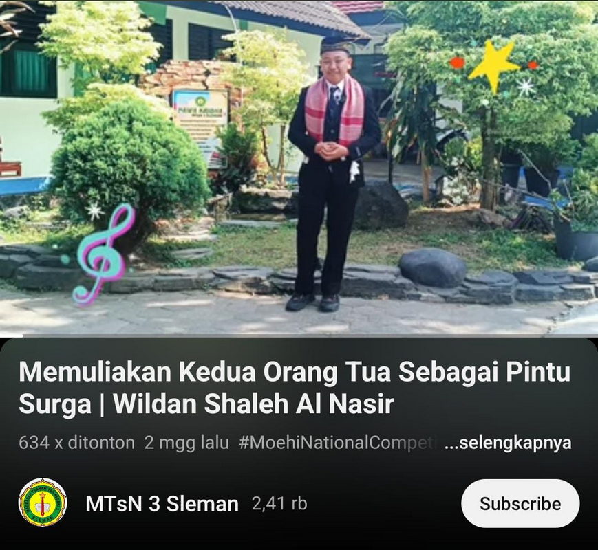 Kemenag Sleman News_(MTsN 3 Sleman)_Ajang Kompetisi yang aktif diikuti oleh MTsN 3 Sleman Adalah MONACO #10. MTsN 3 Sleman sedikitnya mengirimkan 18 perwakilan siswa yang unggul dalam berbagai cabang lomba yang diselenggarakan dalan even edisi kesepuluh dari Moehi National Competition tersebut. Dalam kompetisi berskala nasional yang diselenggarakan oleh SMA Muhammadiyah 1 Yogyakarta tersebut, perwakilan MTsN 3 Sleman Wildan Shaleh Al Nashir berhasil lolos pada babak penyisihan cabang lomba Dai Muda. Wildan unggul dalam penampilan, gestur, intonasi maupun ekspresi sehingga dipastikan melenggang ke babak final. Pembimbing lomba sekaligus guru Bahasa Indonesia MTsN 3 Sleman Susilowati, S.Pd mengungkapkan pihaknya mendampingi persiapan wildan dalam mengikuti lomba tersebut dengan cukup intens. βKami melakukan pembimbingan sebanyak empat kali. Semoga akan membawa hasil yang baik pada final nantiβ, tutur Susi. (ind)