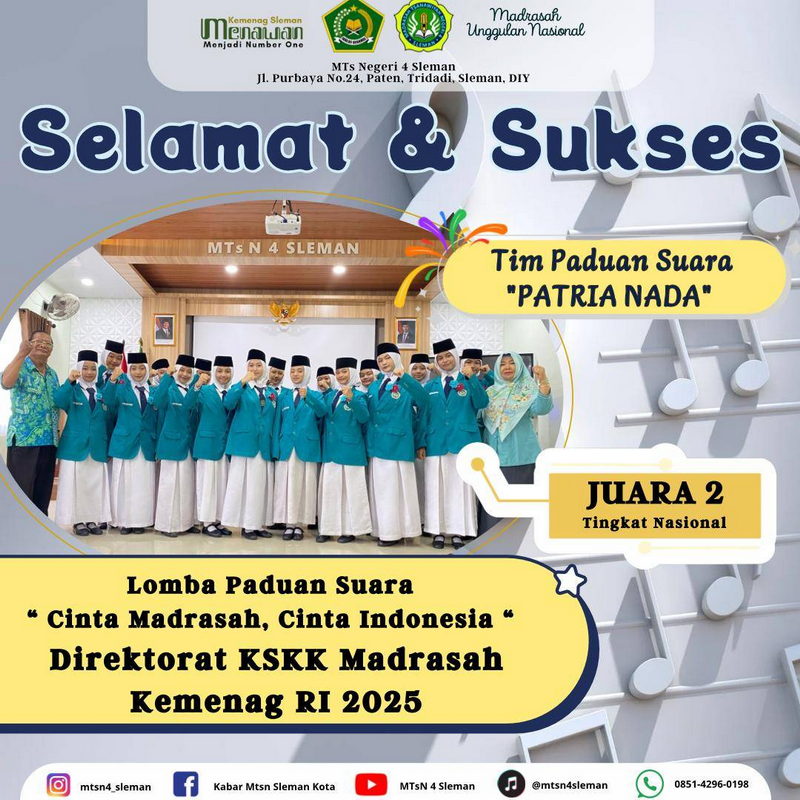 Dengan capaian membanggakan ini, MTsN 4 Sleman semakin mantap menorehkan prestasi di kancah nasional. Patria Nada menjadi bukti nyata bahwa seni suara di madrasah mampu berkembang dan bersaing secara profesional. (epr/tnf)