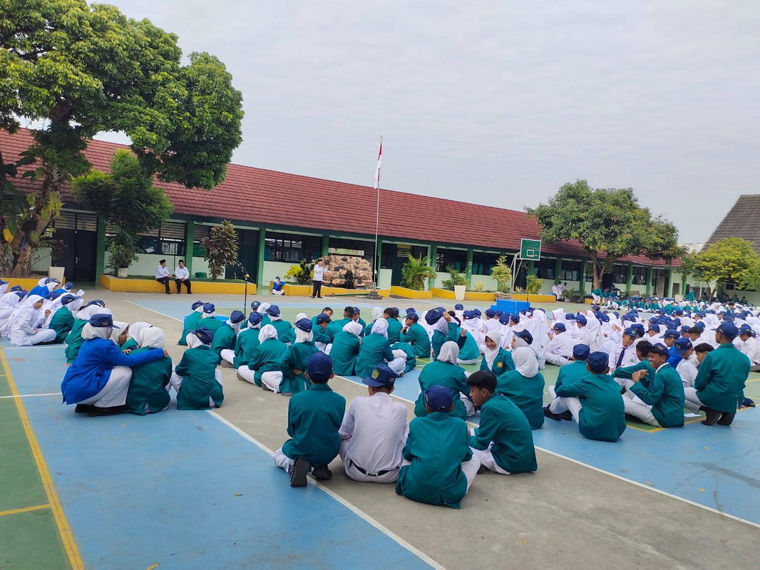 Kemenag Sleman News (MTs Negeri 3 Sleman) – Pengarahan penerimaan Makan Bergizi Gratis MTs Negeri 3 Sleman digelar pada Senin (8/9/2025) di lapangan upacara pukul 07.25 WIB. Haji Masruri, S.Pd.I. selaku wakil kepala madrasah bidang sarana prasarana sekaligus penanggung jawab MBG menjelaskan kepada seluruh murid kelas VII, VIII, IX MTs Negeri 3 Sleman dengan teliti dan runtut segala teknik pelaksanaan pembagian dan distribusi ke kelas-kelas. Masruri memastikan agar anak-anak tertib menerima distribusi Makan Bergizi Gratis yang dibagikan oleh guru piket dibantu keamanan madrasah dan ketua kelas. βAlhamdulillah kita syukuri akhirnya MBG benar-benar sampai ke tangan kita hari pertama ini, jangan sampai berebut dan ada yang tidak kebagian,β terangnya semangat.