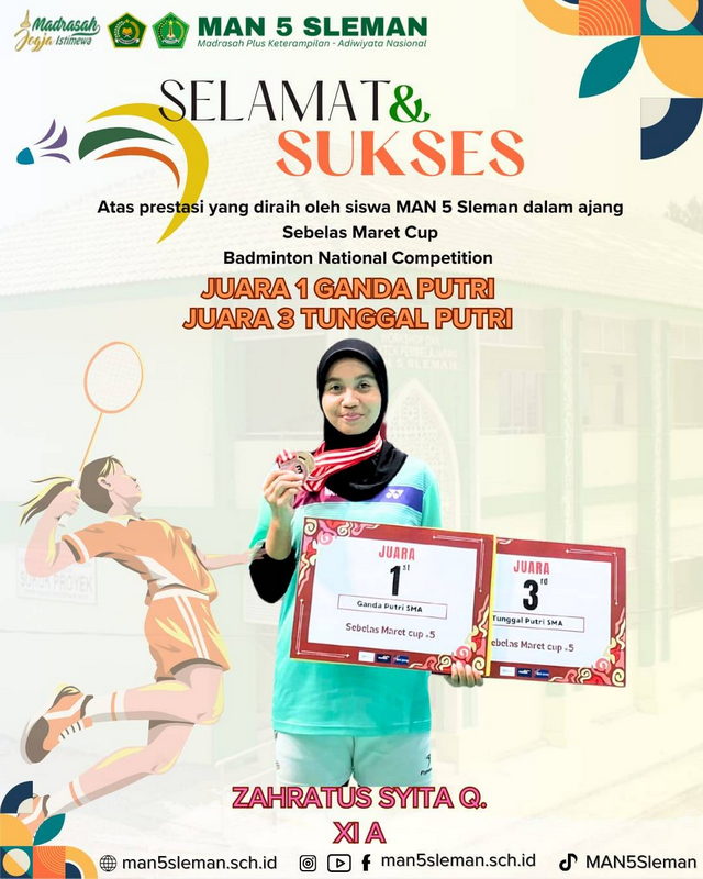 Dalam pertandingan antar-SMA, Zahratus Syita Qotrunnadia berhasil mengharumkan nama MAN 5 Sleman dengan meraih Juara 1 Ganda Putri SMA dan Juara 3 Tunggal Putri SMA. Prestasi ini menjadi pencapaian membanggakan di tengah persaingan ketat antar-atlet bulutangkis dari berbagai daerah.