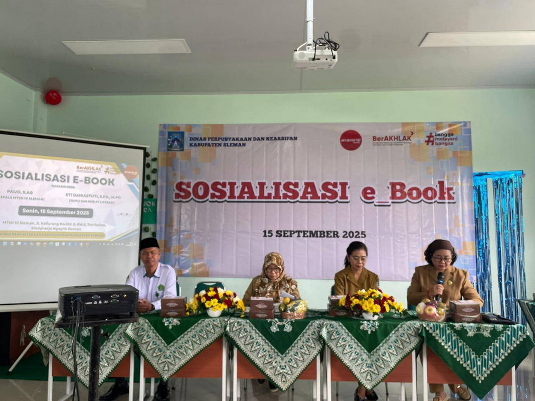 Kemenag Sleman News (MTsN 10 Sleman) – Dinas Perpustakaan dan Kearsipan (Perpusda) Kabupaten Sleman menggelar acara Sosialisasi e-Book sebagai upaya untuk meningkatkan literasi dan memperkenalkan kemudahan akses membaca di era digital. Bekerja sama dengan Madrasah Tsanawiyah Negeri (MTsN) 10 Sleman, kegiatan ini diselenggarakan di aula madrasah, Selasa (15/9/2025). Acara diikuti oleh 50 peserta yang terdiri dari perwakilan kelas, guru serta pustakawan sekolah.