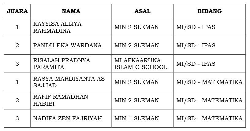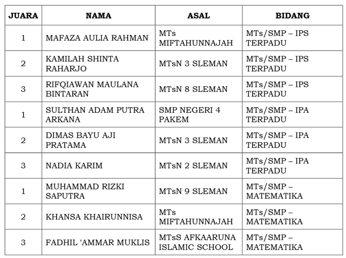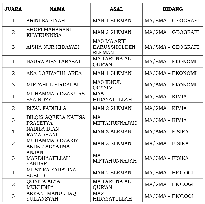 Pada kesempatan tersebut juga diserahkan Piagam Penghargaan oleh Kakan Nadhif didampingi Kasi Dikmad Tulus Dumadi kepada pemenang Olimpiade Madrasah Indonesia (OMI) Bidang Sains Tingkat Kabupaten Sleman Tahun 2025. Kegiatan ini dilaksanakan beberapa waktu lalu tepatnya Senin (9/9/2025) di Aula MAN 3 Sleman. Berdasarkan SK No 302 Tahun 2025, berikut daftar pemenangnya: