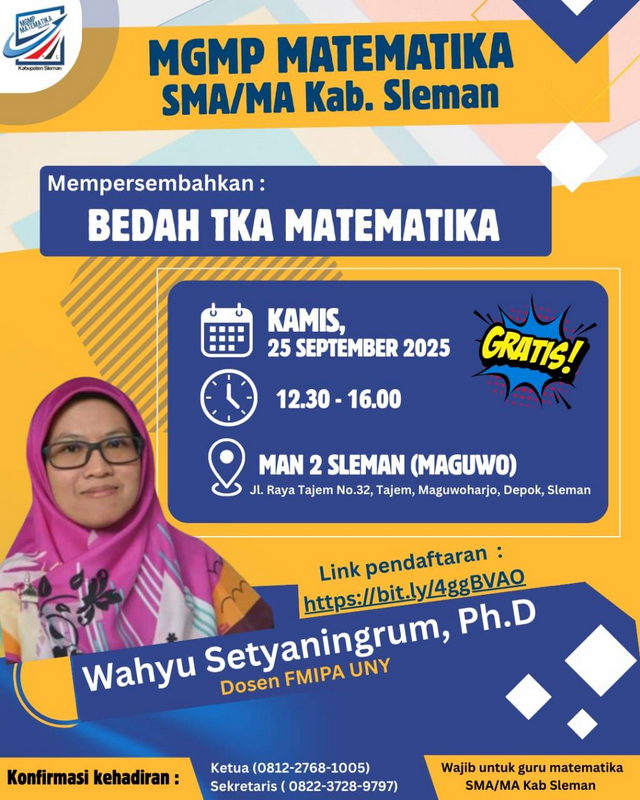 “Kami sangat menyambut baik kegiatan MGMP bersama ini sebagai wadah berbagi ilmu dan pengalaman antar guru matematika, demi meningkatkan mutu pendidikan di Sleman,” ujar Wiranto.
