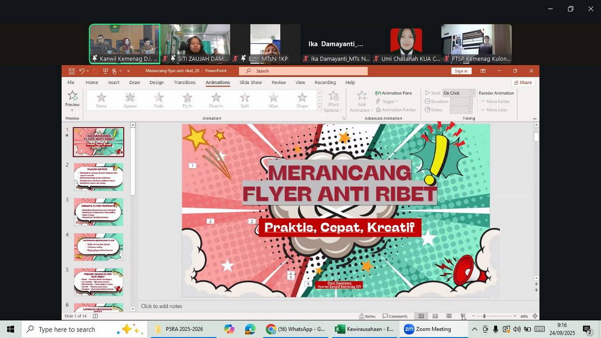 Kemenag Sleman News (MTsN 10 Sleman) –Humas MTsN 10 Sleman, Ika Damayanti, kembali mengikuti kegiatan Penguatan Kapasitas bagi PIC Berita Satuan Kerja yang digelar oleh Kantor Wilayah (Kanwil) Kementerian Agama DIY. Acara yang merupakan rangkaian lanjutan ini diselenggarakan secara hybrid (luring dan daring) pada Rabu (24/9/2025) dengan mengangkat tema “Membuat Flyer Anti Ribet”.