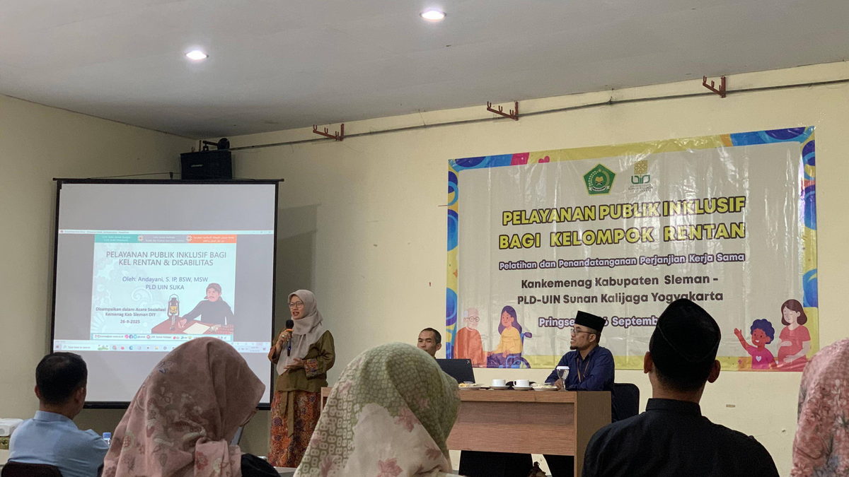 Acara menghadirkan narasumber dari UIN Yogyakarta, yakni Dr. Asep Jahidin, S.Ag., M.Si., dan Dr. Andayani, S.IP., BSW., MSW., yang memaparkan pentingnya kerja sama antara Kankemenag Sleman dan Pusat Layanan Difabel (PLD) UIN Yogyakarta dalam menghadirkan pelayanan inklusif. UIN Sunan Kalijaga menjadi universitas pertama di Indonesia yang membuka layanan bagi mahasiswa penyandang disabilitas, dengan 98 mahasiswa aktif hingga saat ini. Sementara itu, MAN 2 Sleman tercatat sebagai madrasah pertama di Indonesia yang menyediakan layanan serupa dengan 31 siswa aktif.