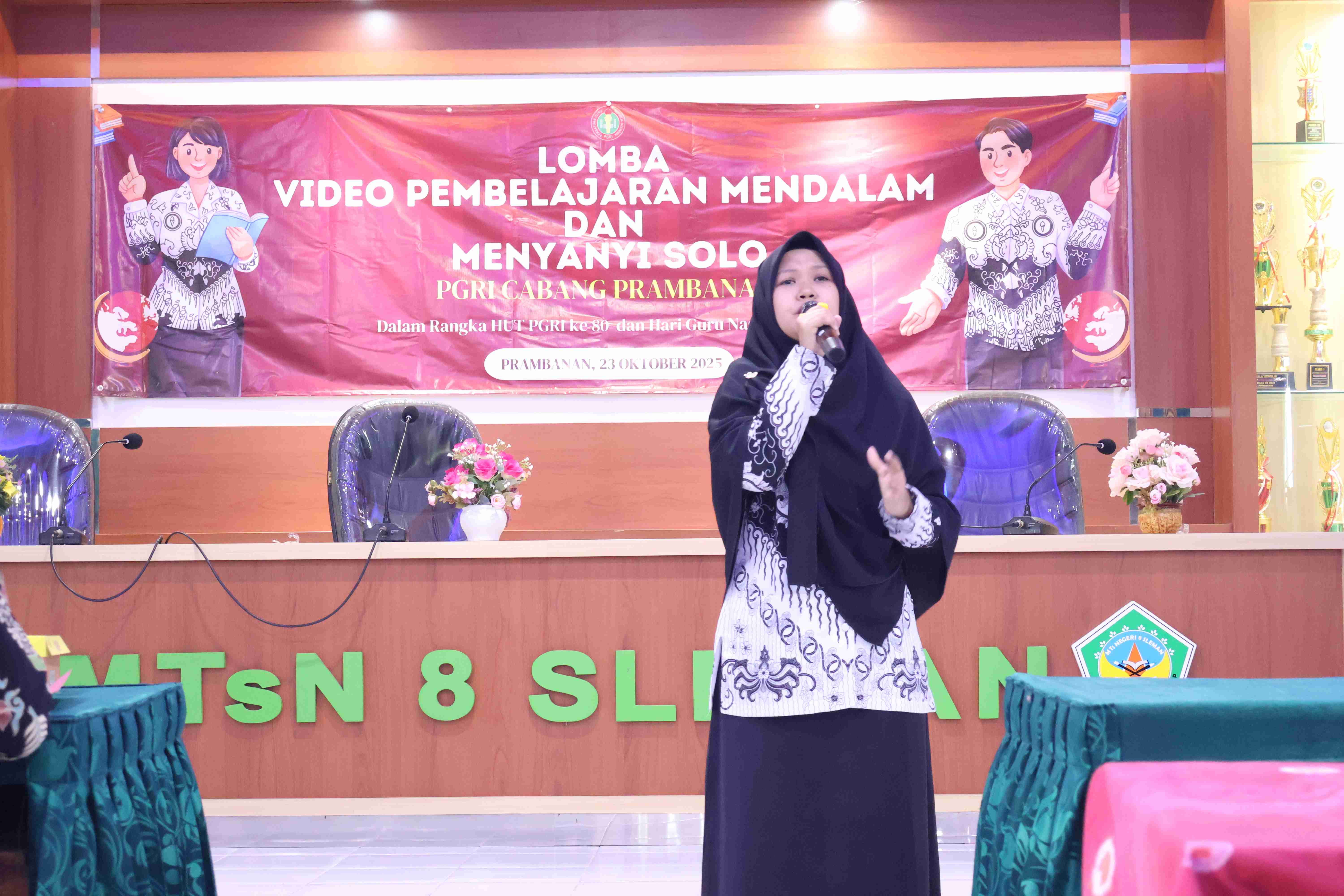 Kemenag Sleman News – (MTsN 8 Sleman) Suasana Aula MTsN 8 Sleman pada Rabu (22/10/2025) terasa begitu hangat dan penuh semangat. Dalam rangka menyambut Hari Guru Nasional, PGRI Cabang Kapanewon Prambanan menggelar berbagai lomba yang diikuti oleh guru-guru dari jenjang SD hingga SMA/SMK. Salah satu momen yang paling memikat perhatian penonton adalah ketika Novita Suryaningtyas Sitoresmi, S.Pd., guru Bahasa Jawa dari MTsN 8 Sleman, tampil dalam ajang Lomba Menyanyi Solo dan berhasil memukau para juri serta hadirin yang memenuhi aula.