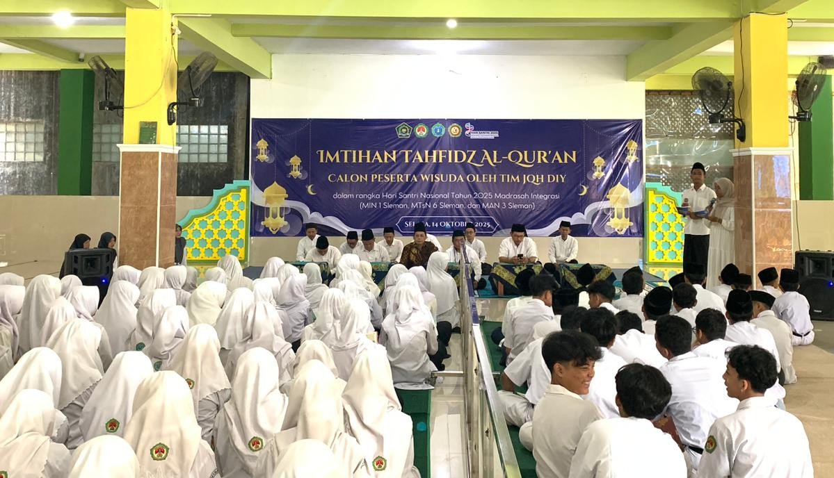Kemenag Sleman News (MAN 3 Sleman) – Dalam rangka memperingati Hari Santri Nasional 2025, tiga satuan pendidikan di bawah naungan Madrasah Integrasi (MIN 1 Sleman, MTsN 6 Sleman, dan MAN 3 Sleman) menyelenggarakan kegiatan Imtihan Tahfidz Al-Qur’an bagi calon peserta wisuda tahfidz.