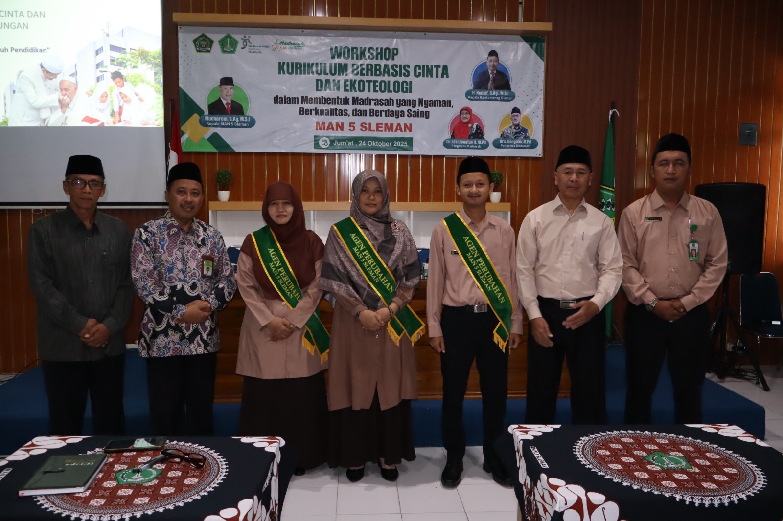 Kemenag Sleman News – MAN 5 Sleman mengukuhkan tiga guru sebagai agen perubahan pada Jumat, 24 Oktober 2025, dalam rangkaian Workshop Kurikulum Berbasis Cinta dan Ekoteologi yang digelar di ruang AVA madrasah. Prosesi penyematan selempang dilakukan langsung oleh Kepala Kantor Kementerian Agama Kabupaten Sleman, H. Nadhif, S.Ag., M.S.I., sebagai simbol lahirnya motor penggerak transformasi pendidikan di MAN 5 Sleman.