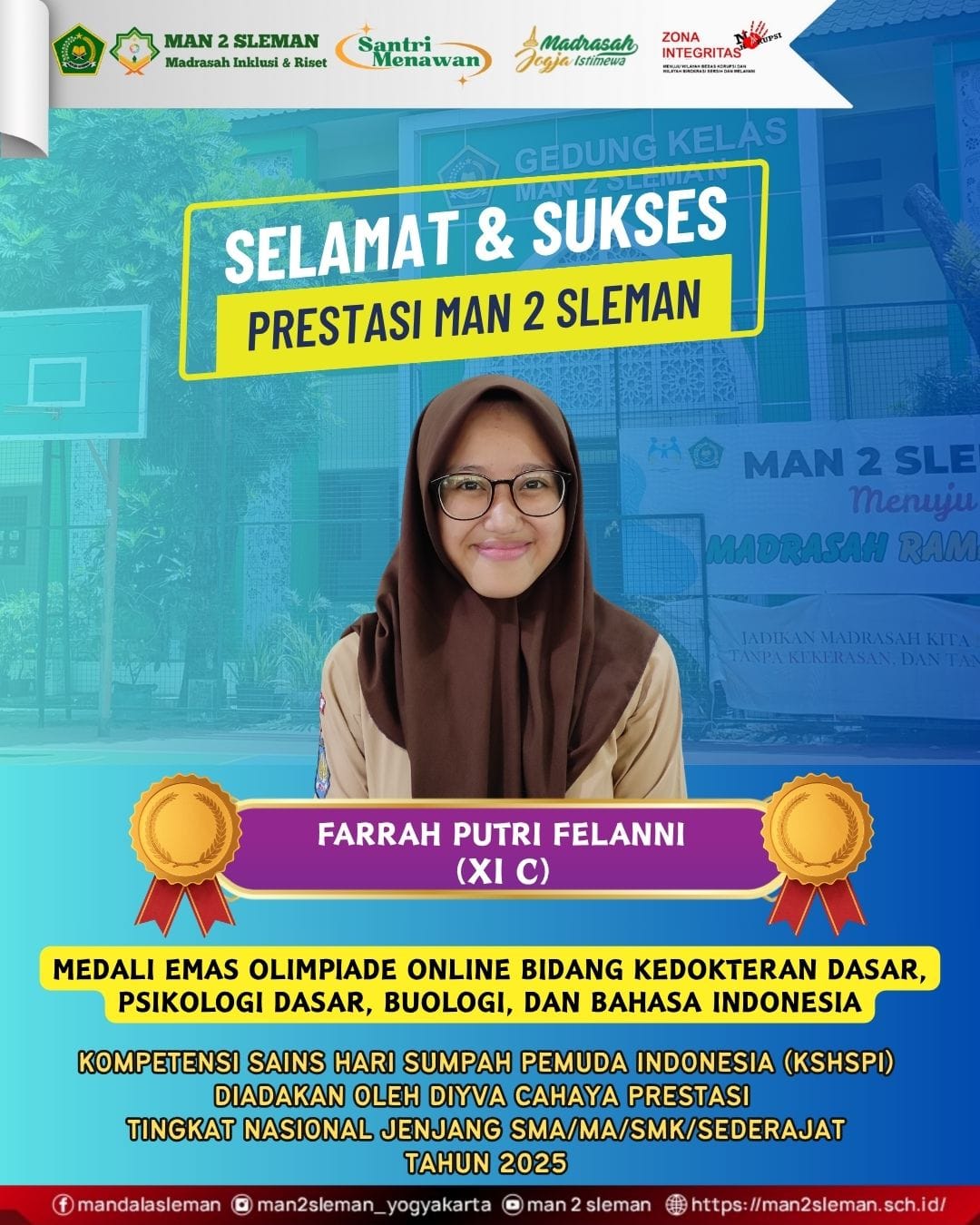 Kemenag Sleman News (MAN 2 Sleman) — Sebuah pencapaian yang sangat gemilang kembali diraih oleh salah satu siswa MAN 2 Sleman. Farrah Puti Felanni (XI C) berhasil meraih empat medali emas bidang Kedokteran Dasar, Psikologi Dasar, Biologi dan Bahasa Indonesia dalam ajang nasional Kompetisi Sains Hari Sumpah Pemuda Indonesia 2025. Kompetisi ini diadakan oleh Divya Cahaya Prestasi, yang digelar pada 25–26 Oktober 2025 mendatang sebagai bagian dari peringatan Hari Sumpah Pemuda.