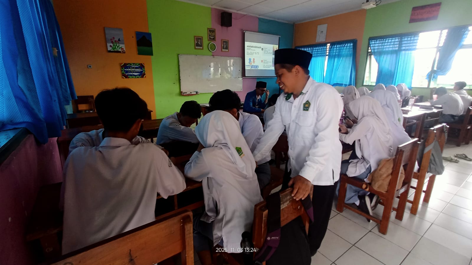 Suasana kelas berjalan khidmat namun interaktif. Siswa terlihat antusias ketika diminta berbagi contoh sikap ramah dalam kehidupan di lingkungan sekolah maupun masyarakat. Melalui metode diskusi dan refleksi nilai, pembelajaran terasa bermakna dan membekas bagi peserta didik.