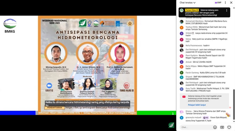 Webinar kali ini menghadirkan narasumber dari berbagai institusi strategis yang kompeten di bidang klimatologi, mitigasi bencana, dan perubahan iklim. Hadir dalam ruang virtual Miming Saepudin, M.Si, Koordinator Bidang Prediksi dan Peringatan Dini Cuaca BMKG; Dr. Ir. Amien Widodo, M.Si, Peneliti Senior Pusat Penelitian Mitigasi Kebencanaan dan Perubahan Iklim ITS serta Dosen Teknik Geofisika ITS; Prof. Ir. Dwikorita Karnawati, M.Sc., Ph.D., Guru Besar Universitas Gadjah Mada sekaligus Kepala BMKG periode 2017–2025.