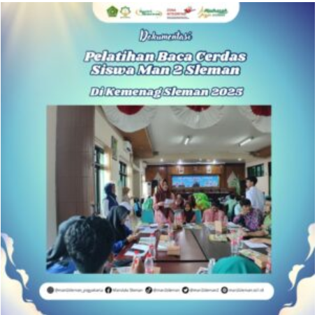 Kemenag Sleman News (MAN 2 Sleman) – Kementerian Agama Kabupaten Sleman menyelenggarakan Pelatihan Baca Cerdas pada Sabtu–Ahad (15–16/11/2025) bertempat di Aula Lantai 3 Kantor Kementerian Agama Sleman. Sebagai wujud dukungan terhadap penguatan budaya literasi madrasah, MAN 2 Sleman menugaskan tiga siswa Duta Literasi Perpustakaan Bahrul Ilmi dari kelas X dan XI sebagai peserta, yaitu Alvin Ibnu Azzam (X B), Siti Raihana Nur Kamila (X F), dan Shafa Nabilah (XI D).