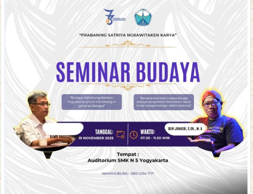 Kemenag Sleman News (MTsN 10 Sleman)– Sargiyono, S.Pd., guru mata pelajaran Seni Budaya dan Keterampilan dari MTsN 10 Sleman, mengikuti Seminar Budaya yang diselenggarakan oleh SMKN 5 Yogyakarta dalam rangka merayakan Hari Ulang Tahun (HUT) ke-73 sekolah tersebut. Acara yang diikuti guru , pengajar, dan penggiat seni berlangsung di Auitorium SMKN 5 Yogyakarta pada Rabu, (19/11/2025)