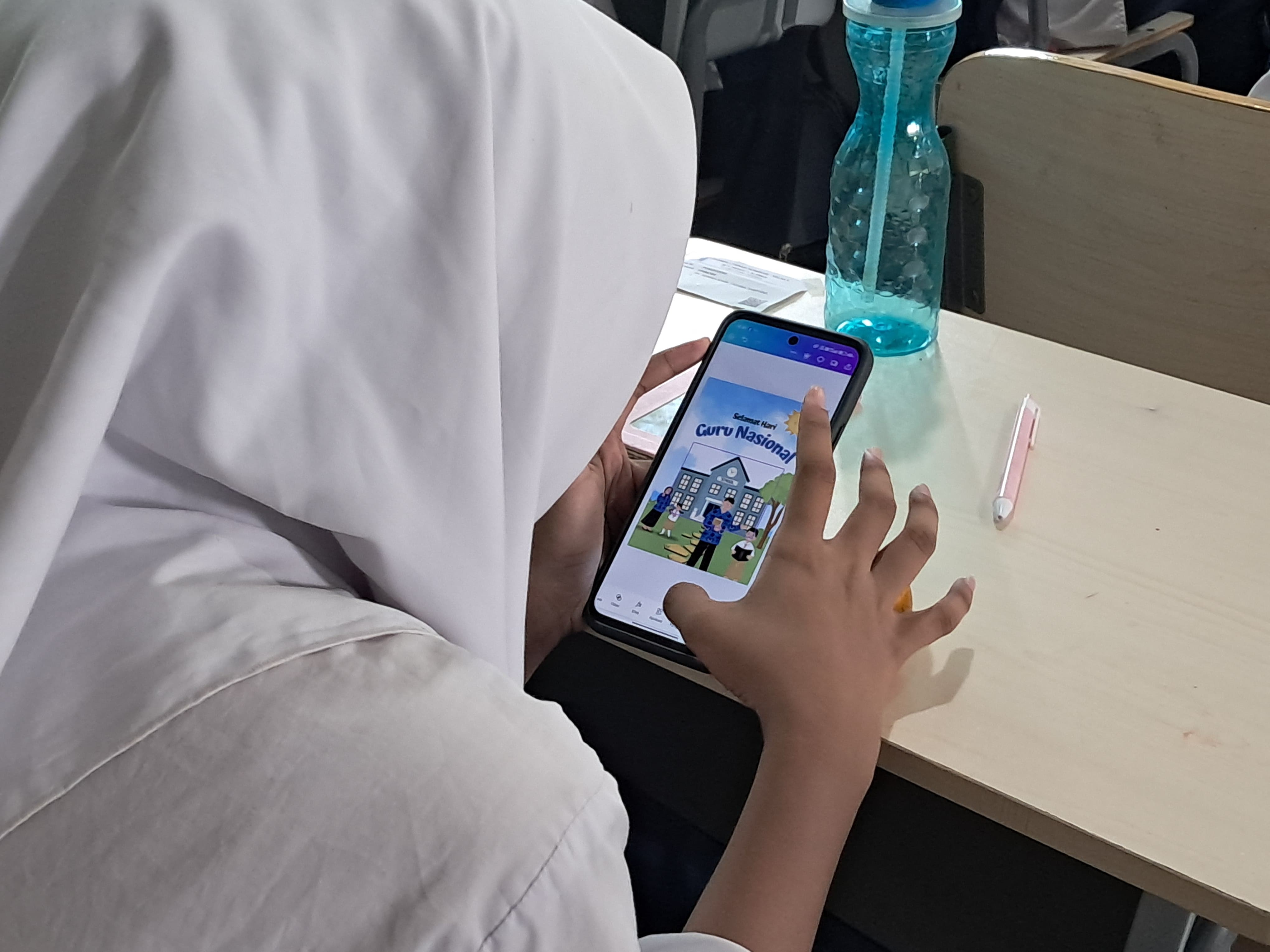 Dalam kegiatan tersebut, siswa memanfaatkan gawai dan aplikasi desain grafis sederhana untuk membuat poster yang memuat pesan positif mengenai peran guru di era masyarakat cerdas (smart society). Para siswa diajak untuk menuangkan ide kreatif mereka melalui desain visual yang komunikatif, memadukan teks, warna, dan ilustrasi secara tepat.