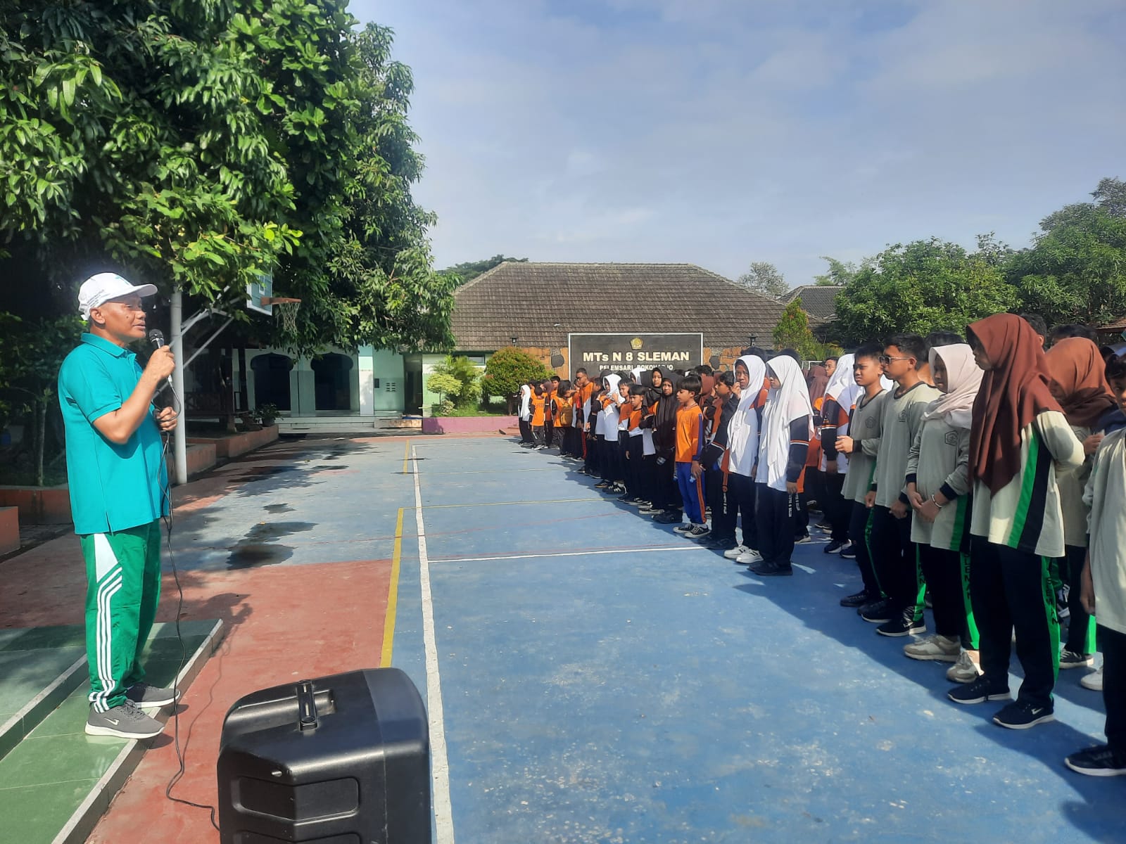 Kemenag Sleman News (MTsN 8 Sleman) – Kegiatan jalan sehat MTsN 8 Sleman yang digelar pada Jumat (21/11/2025) diawali dengan arahan langsung dari Kepala MTsN 8 Sleman, Agus Sholeh, S.Ag. Sebelum peserta diberangkatkan, seluruh siswa berkumpul di halaman madrasah untuk mendengarkan pesan penting dari beliau. Suasana pagi yang cerah membuat para siswa terlihat bersemangat, namun tetap tertib mengingat kegiatan ini merupakan salah satu agenda besar madrasah dalam rangka syiar dan mempererat kebersamaan.