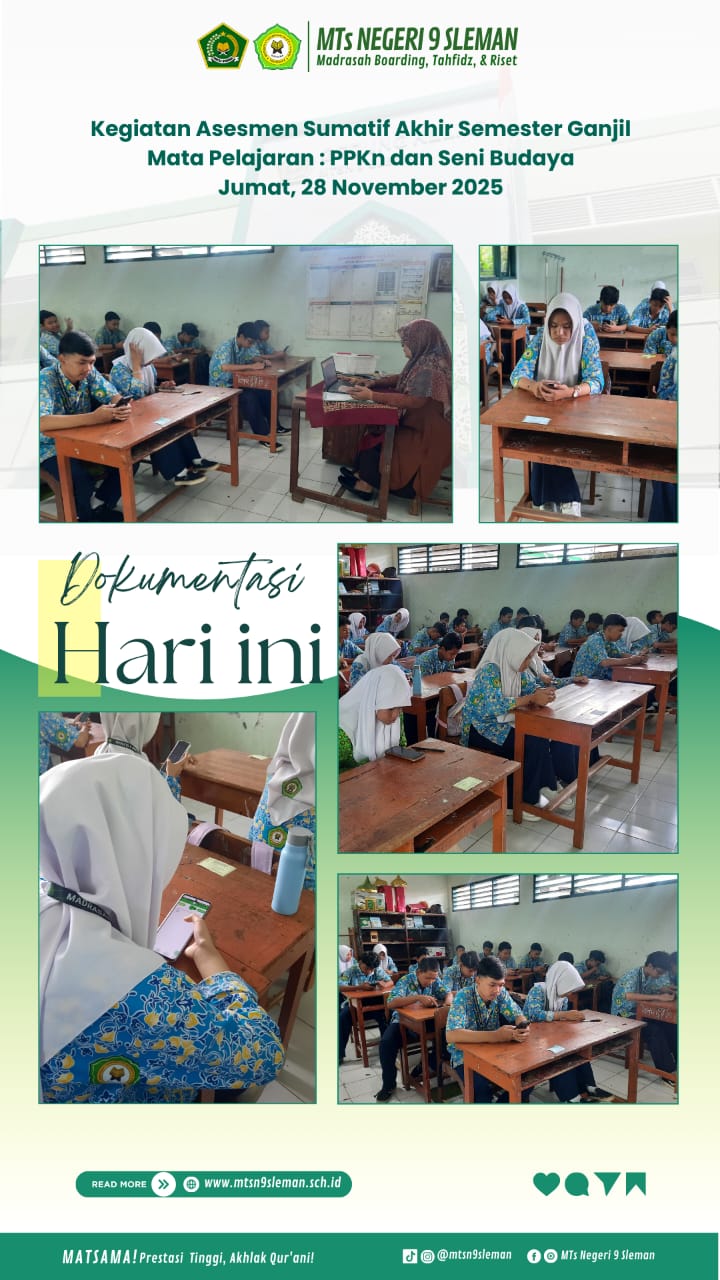 Kemenag Sleman News (MTsN 9 Sleman) – Siswa-siswi MTsN 9 Sleman melaksanakan Asesmen Sumatif Akhir Semester (ASAS) Ganjil hari keempat pada Jumat (28/11/2025). Sesuai jadwal yang ditetapkan tim kurikulum madrasah, siswa-siswi kelas VII, VIII, dan IX mengerjakan dua mata pelajaran yaitu PPKn dan Seni Budaya. Pelaksanaan asesmen berjalan tertib dan lancar dengan pengawasan yang dilakukan oleh guru sesuai pembagian tugas.