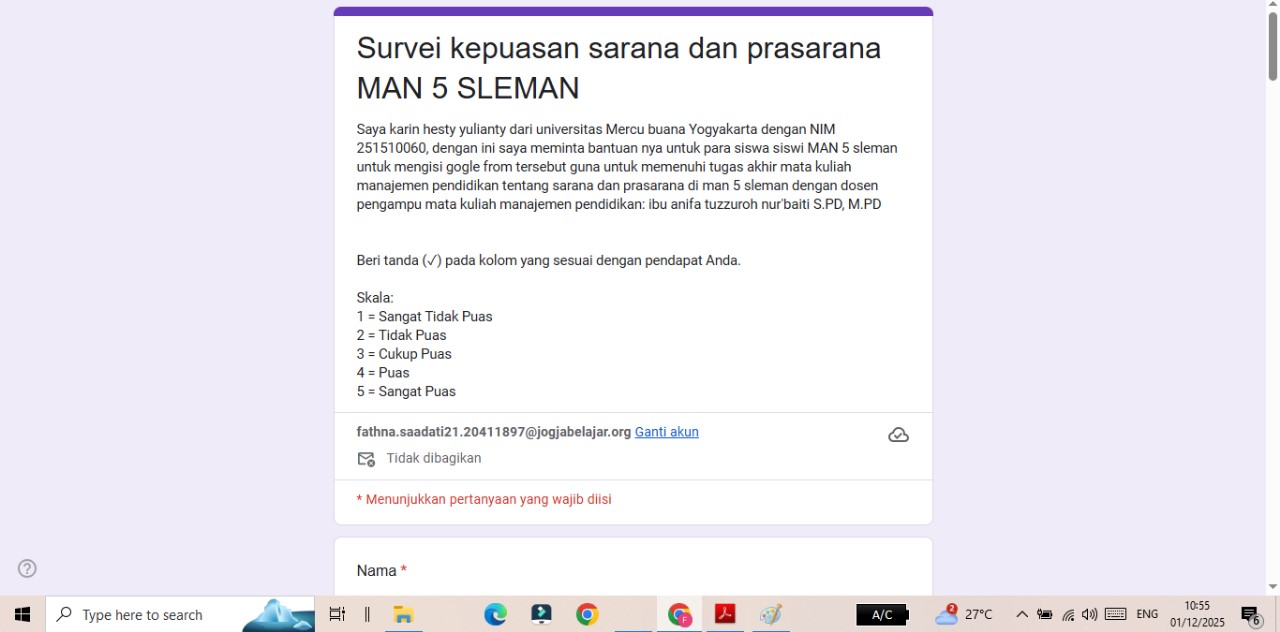 Kegiatan ini dihadiri oleh Karin Hesty, mahasiswa Universitas Mercu Buana Yogyakarta jurusan Bimbingan dan Konseling. Adapun agenda utama yang dibahas dalam pertemuan tersebut adalah konsultasi terkait penyusunan dan validasi angket untuk keperluan observasi sarana dan prasarana (sarpras) di MAN 5 Sleman.
