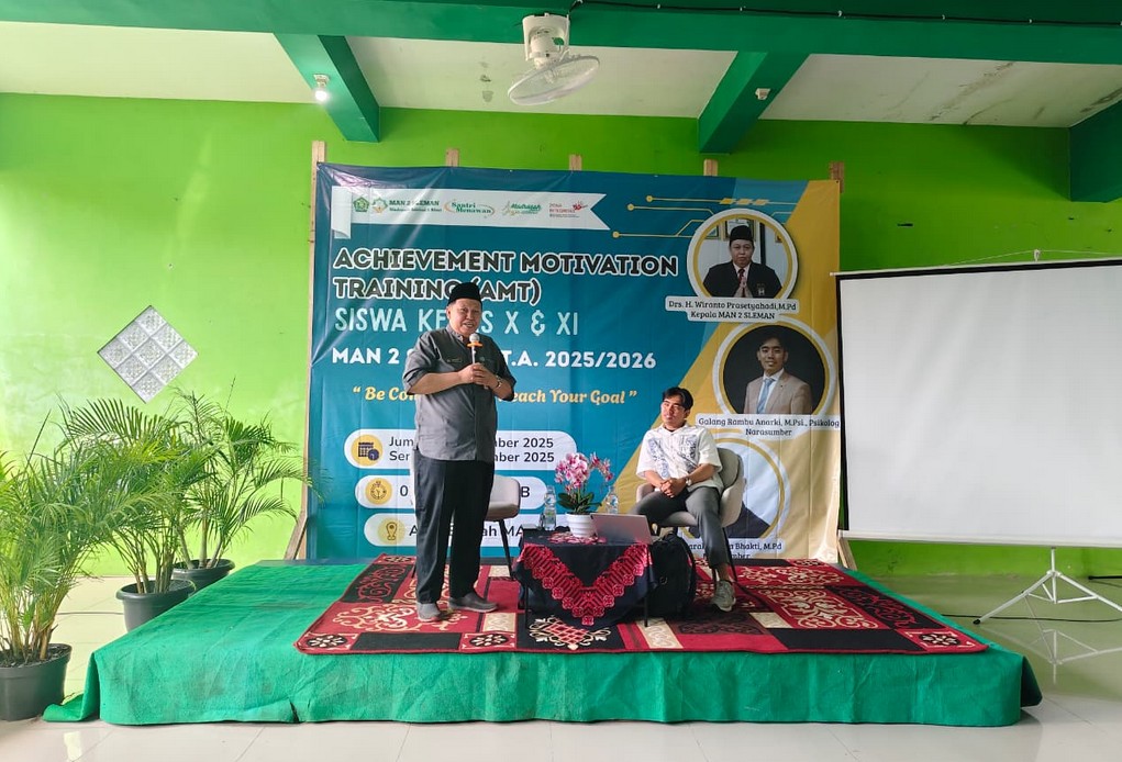 Kemenag Sleman News (Man 2 Sleman) — MAN 2 Sleman mengadakan kegiatan Achievement Motivation Training (AMT) bagi seluruh siswa kelas X pada Jumat (05/12/25). Kegiatan yang berlangsung di aula bawah MAN 2 Sleman tersebut dimulai pukul 07.30 hingga 11.00 WIB dengan mengusung tema “Be Consistent to Reach Your Goal”.