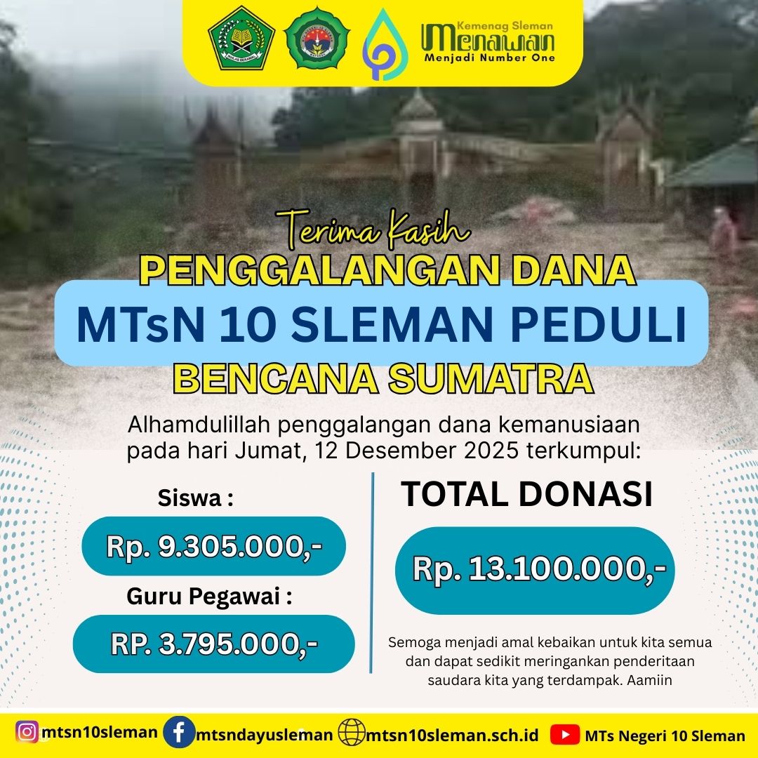Kemenag Sleman News (MTsN 10 Sleman) – Bencana banjir dan longsor yang melanda Aceh dan sebagian wilayah Sumatra lainnya telah menimbulkan keprihatinan mendalam rakyat Indonesia bahkan dunia. Sebagai wujud solidaritas nyata, MTsN 10 Sleman mengadakan penggalangan dana yang melibatkan guru, pegawai, dan seluruh murid madrasah. Berlangsung seama empat hari, penggalangan dana berakhir Jumat (12/12/2025)