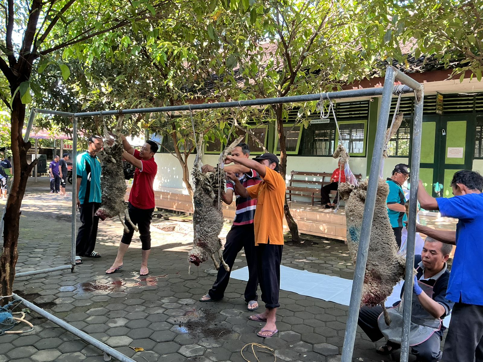 Penyembelihan tiga ekor kambing dilakukan secara langsung oleh Kepala MTsN 5 Sleman, Drs. H. Busyroni Majid, M.Si. Dengan penuh ketenangan dan kekhidmatan, proses penyembelihan berlangsung tertib serta disaksikan oleh para guru dan karyawan yang turut hadir.