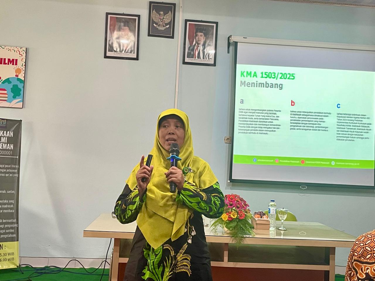 Pengawas Pembina Madrasah, Asih Budiati, S.Pd., M.Sc., memaparkan bahwa KMA 1503 bertujuan mengembangkan potensi peserta didik agar menjadi manusia yang beriman, bertakwa, berakhlak mulia, dan berkarakter Pancasila.