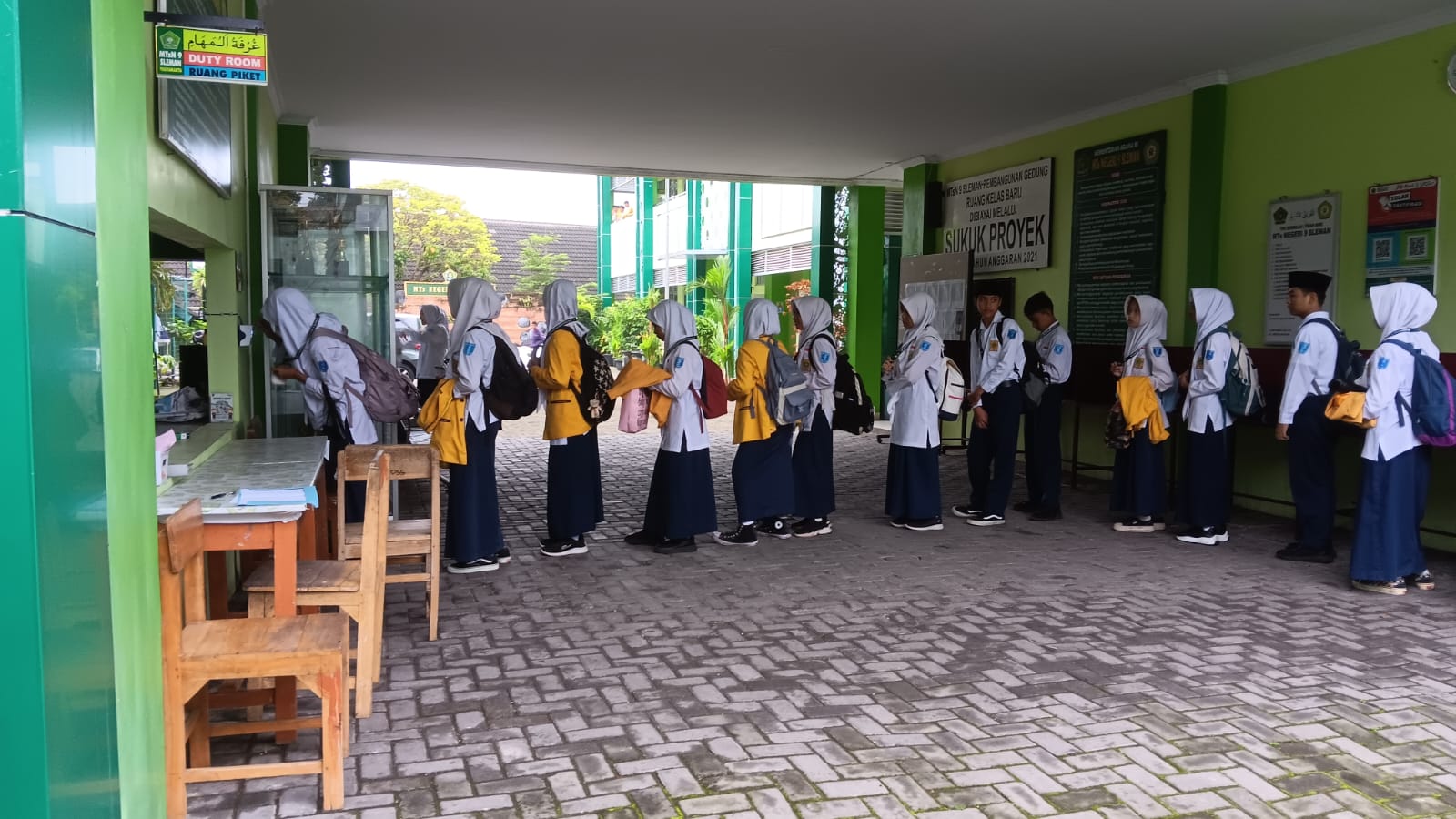 Sebelum menuju kelas halaqoh masing-masing, seluruh siswa melakukan presensi barcode di ruang piket. Kepala MTsN 9 Sleman yakni Siti Juwariyah mengungkapkan bahwa “Hari ini adalah hari pertama semua siswa masuk madrasah di semester genap, dengan tahun baru dan semester baru semoga anak-anak juga memiliki semangat yang baru dalam belajar untuk mengapai cita-cita,” ujar Siti Juwariyah.