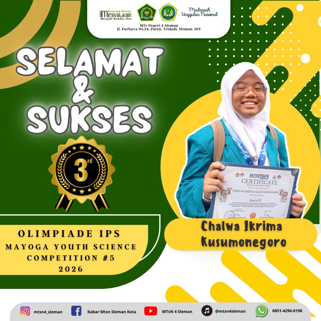 Kemenag Sleman News (MTsN 4 Sleman) – Siswa MTsN 4 Sleman kembali menorehkan prestasi membanggakan di tingkat nasional. Pada ajang MYSCOM (Mayoga Youth Sains COMpetition) #5, seorang siswa MTsN 4 Sleman berhasil meraih Juara 3 Olimpiade IPS. Kegiatan ini diselenggarakan di MAN 3 Sleman, Sabtu (7/2/2026), dan diikuti oleh peserta dari berbagai SMP/MTs dari seluruh Indonesia.