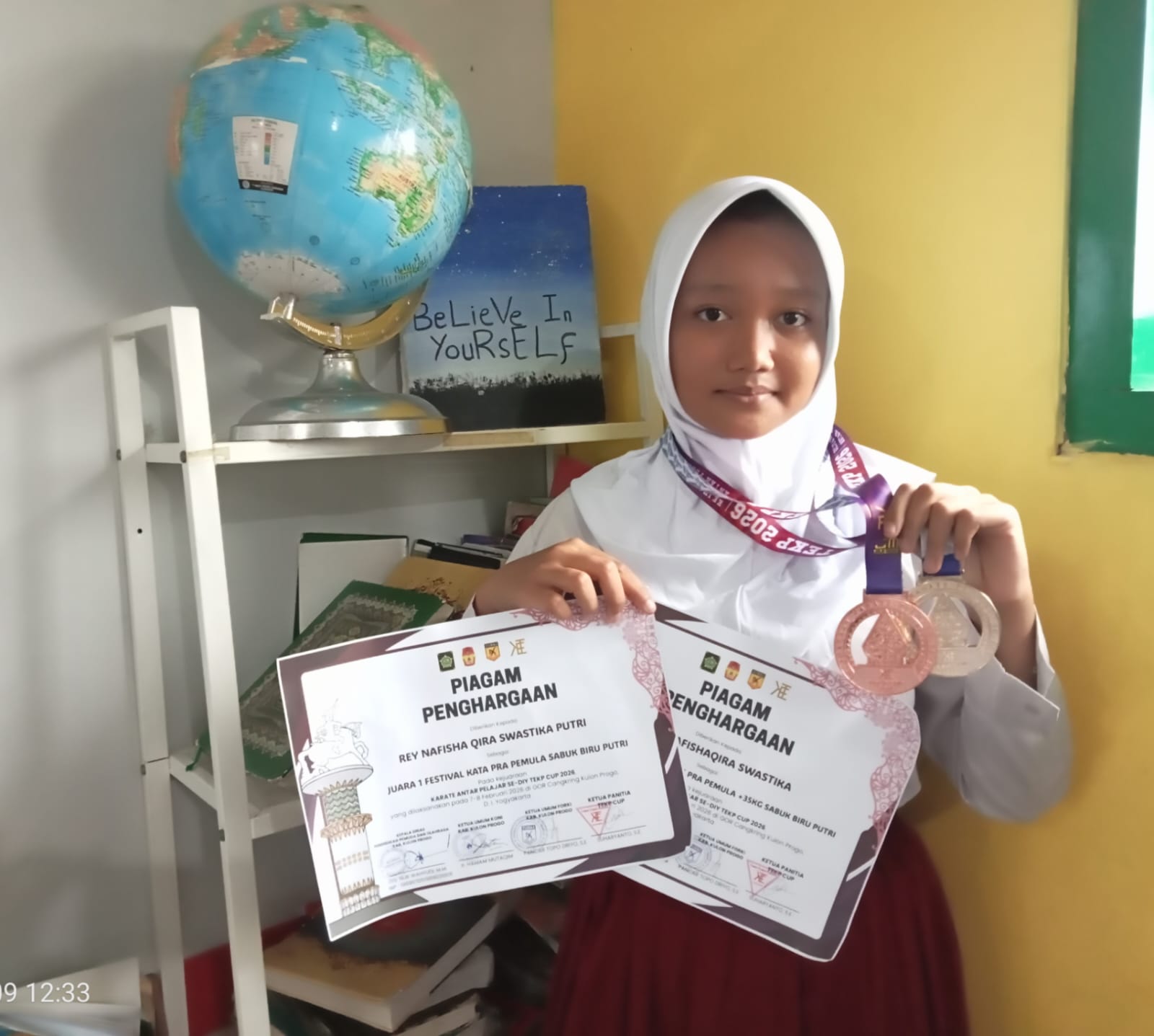 Kemenag Sleman News ( MIN 2 Sleman ) – Prestasi membanggakan kembali ditorehkan oleh murid MIN 2 Sleman. Rey Nafisha Qira Swastika Putri berhasil meraih Juara 1 Festival Kata Pra Pemula Sabuk BiruPutri dan juara 3 Festival Kumite Pra Pemula + 35 KG Sabuk Biru Putri dalam ajang Kejuaraan Karate AntarPelajar se-DIY TEKP Cup 2026bertempat di GOR Cangkring Kulonprogo pada Sabtu – Minggu, 7-8 Februari 2026.