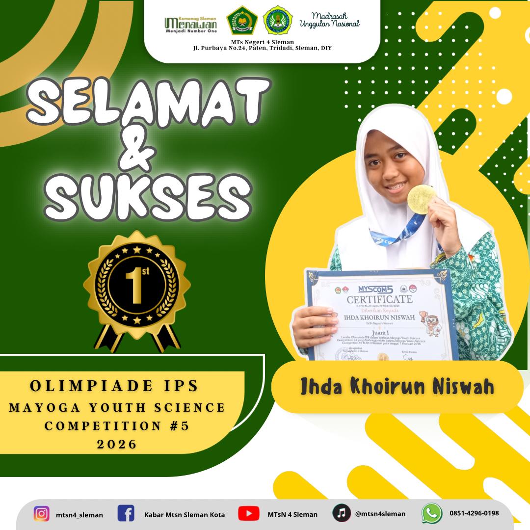 Kompetisi MYSCOM #5 mempertandingkan beberapa cabang lomba, antara lain Olimpiade IPA, Olimpiade Matematika, Olimpiade IPS, dan Lomba Esai. Dalam cabang Olimpiade IPS, Ihda Khoirun Niswah, siswa MTsN 4 Sleman, tampil gemilang dan berhasil menyabet Juara 1, mengungguli peserta dari berbagai daerah di Indonesia.