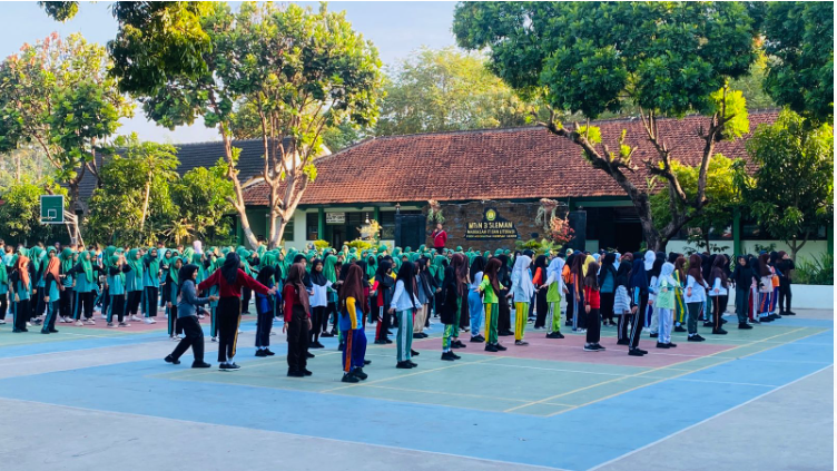 Kemenag Sleman News (MTsN 3 Sleman) – Seluruh warga MTsN 3 Sleman melaksanakan senam pagi bersama yang berlangsung di halaman madrasah pada Jum’at (19/07). Kegiatan ini bertujuan Untuk mendukung proses pembelajaran yang sehat, memberikan penyegaran, serta untuk merilekskan pikiran siswa sebelum menerima pembelajaran di dalam ruang kelas.