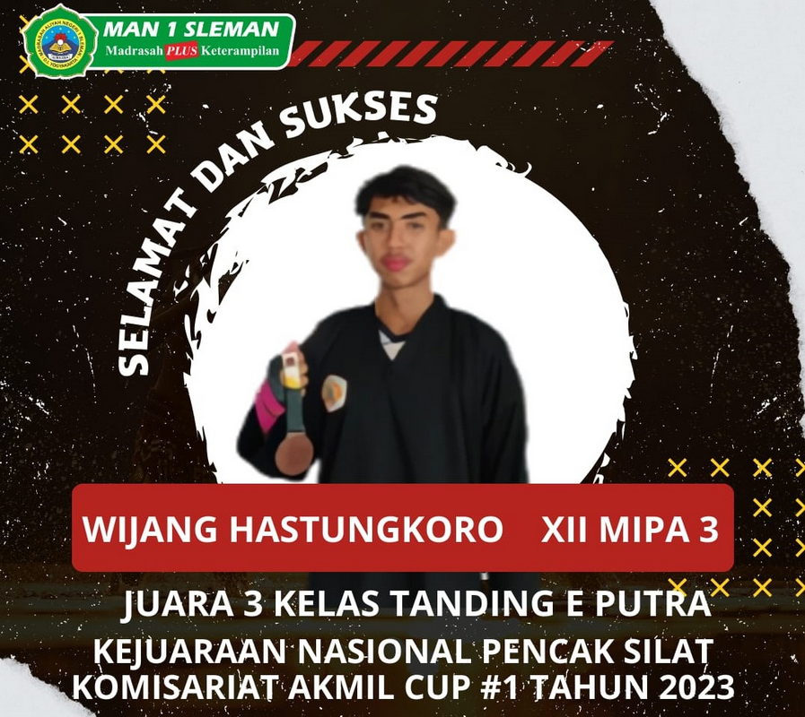 Sleman (MAN 1 Sleman)— Pesilat MAN 1 Sleman, Wijang Hastungkoro (XII MIPA 3) berhasil meraih medali perunggu pada ajang Kejuaraan Nasional Pencak Silat Komisariat AKMIL Cup #1 Tahun 2023 yang digelar Jumat – Minggu , 22 – 24 September 2023 di GOR Soeroto Akademi Militer Magelang Jawa Tengah.