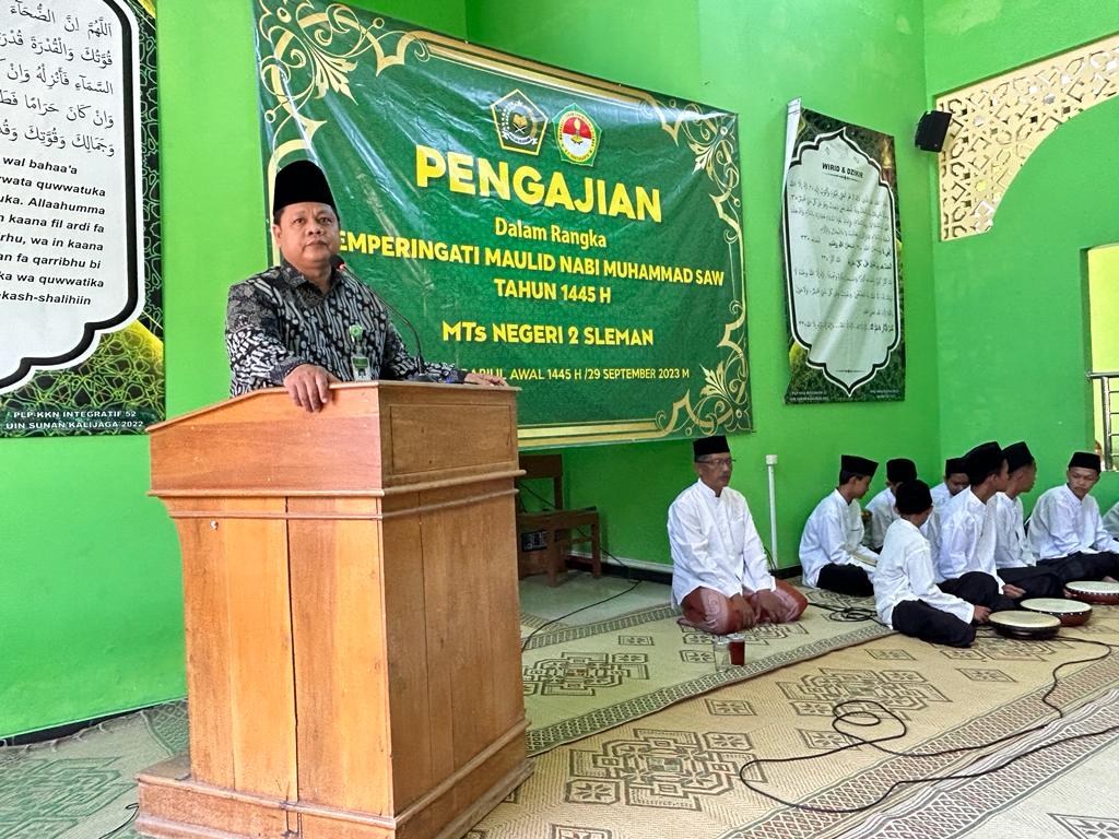 Sleman (MTsN 2) â Peringatan Maulid Nabi Muhammad SAW kembali digelar oleh MTs Negeri 2 Sleman tahun ini. Sehari setelah tanggal kelahiran Nabi Muhammad SAW, pada Jumat (29/9/23), seluruh warga MTsN 2 Sleman mengikuti kegiatan pengajian di Masjid Darul Arqom.