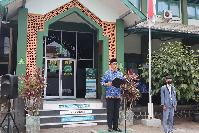 Sleman (MAN 5 Sleman) – Ahad (1/10/23) seluruh Civitas akademika MAN 5 Sleman menyelenggarakan upacara peringatan Hari Kesaktian Pancasila tahun 2023 dengan tema “Pancasila Pemersatu Bangsa Menuju Indonesia Maju”.Upacara dilaksanakan di halaman depan madrasah mulai pukul 07.00 – 08.00 WIB, diikuti oleh peserta didik kelas X, XI, XII dengan mengenakan pakaian putih abu-abu. Sedangkan bapak ibu guru dan pegawai mengenakan pakaian KORPRI. Dimana inspektur upacara adalah Kepala MAN 5 Sleman, Akhmad Mustaqim, S.Ag., MA.