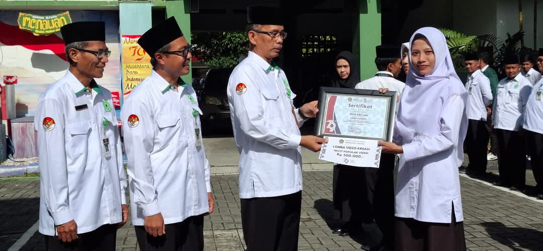Kemenag Sleman News (MTsN 2 Sleman) — MTs Negeri 2 Sleman kembali merayakan prestasi membanggakan dengan penyerahan piagam penghargaan “Most Popular Video”, yang diraih dalam ajang kompetisi video bertema “Bangga Menjadi Bagian dari Kemenag” yang diselenggarakan oleh Kementerian Agama (Kemenag) Kabupaten Sleman. Penyerahan piagam dilakukan setelah upacara bendera pada Senin (6/1/2025) di lapangan upacara MTsN 2 Sleman.
