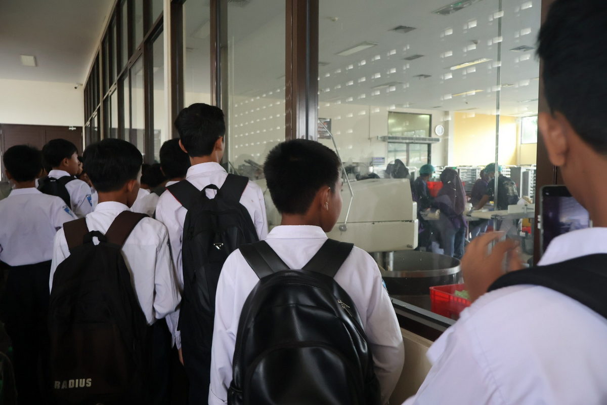 Setelah pengarahan, para siswa memasuki area produksi dan dibagi menjadi beberapa kelompok kecil untuk lebih fokus dalam mengamati setiap tahap pembuatan bakpia. Pemandu dari Pabrik Bakpia Juwara Satoe menjelaskan bahwa proses pembuatan bakpia terdiri dari beberapa tahapan utama yaitu pembuatan adonan, pembentukan dan pemanggangan, serta pengemasan dan distribusi.