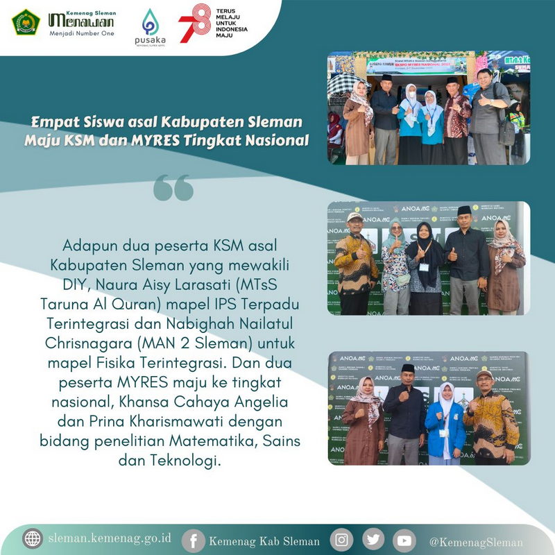 Adapun dua peserta KSM asal Kabupaten Sleman yang mewakili DIY, Naura Aisy Larasati (MTsS Taruna Al Quran) mapel IPS Terpadu Terintegrasi dan Nabighah Nailatul Chrisnagara (MAN 2 Sleman) untuk mapel Fisika Terintegrasi. Dan dua peserta MYRES maju ke tingkat nasional, Khansa Cahaya Angelia dan Prina Kharismawati dengan bidang penelitian Matematika, Sains dan Teknologi.