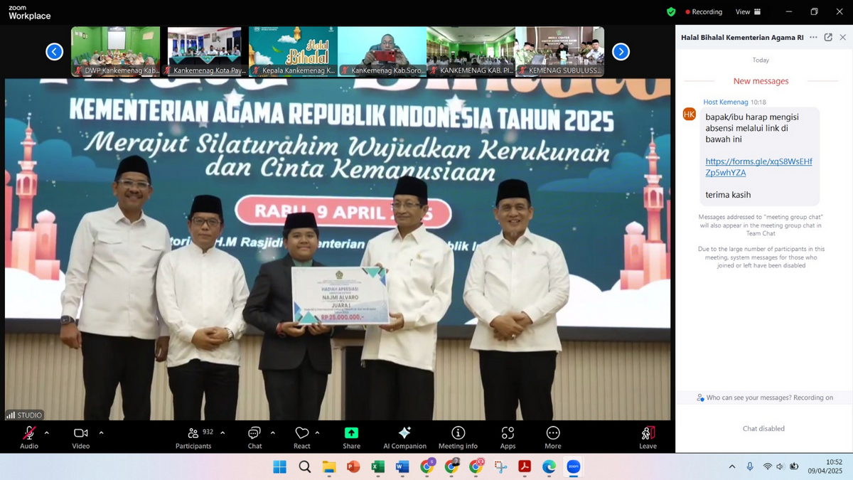 Kemenag Sleman News (MTsN 9) — Kepala MTsN 9 Sleman, Siti Juwariyah, S.Pd., M.Si., M.S.I., turut hadir dalam kegiatan Syawalan Nasional yang diselenggarakan oleh Kementerian Agama Republik Indonesia secara virtual melalui Zoom Meeting.