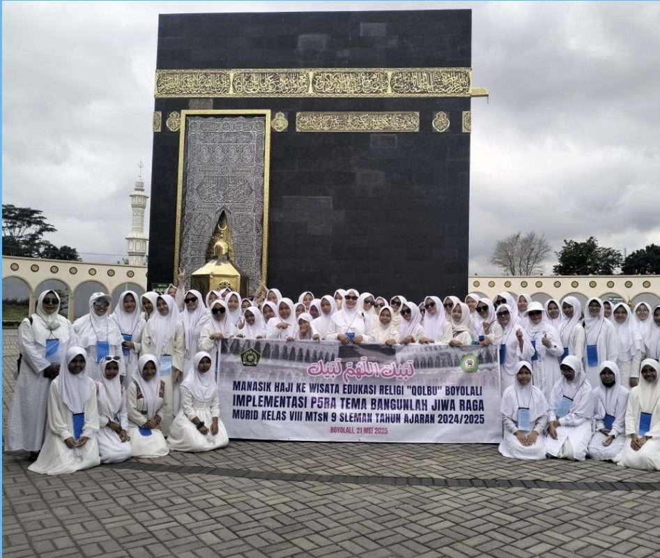 Kemenag Sleman News (MTsN 9 Sleman)- MTsN 9 Sleman menyelenggarakan kegiatan manasik haji dan umroh bagi siswa kelas VIII pada hari Rabu (21/5/2025) di Wisata Edukasi Religi “Qolbu” Boyolali. Kegiatan ini merupakan bagian dari implementasi Projek Penguatan Profil Pelajar Rahmatan Lil ‘Alamin (P5RA) dengan tema “Bangunlah Jiwa dan Raga”, yang menjadi fokus P5RA semester genap bagi siswa kelas VIII.