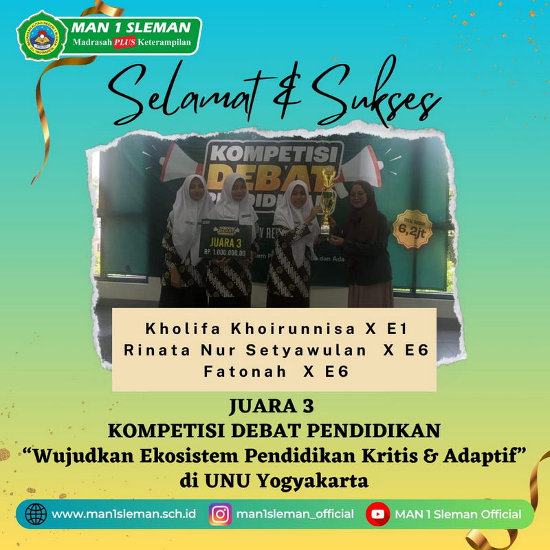 Sleman (MAN 1 Sleman) – Tim MAN 1 Sleman berhasil meraih juara 3 Kompetisi Debat Pendidikan yang digelar oleh Universitas Nahdlatul Ulama (UNU) Yogyakarta. Kompetisi digelar dalam rangka peringatan Hari Santri, mengambil tema Wujudkan Ekosistem Pendidikan Kritis dan Adaptif, dilaksanakan di kampus UNU Yogyakarta pada Sabtu (21/10/2023).