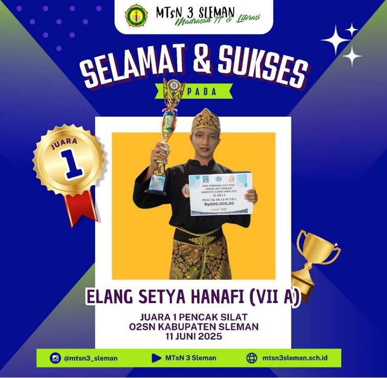 Sleman (MTsN 3 Sleman) – Nama MTsN 3 Sleman kembali berkibar setelah salah satu siswanya berhasil menjadi juara 1 pada Pencak Silat O2SN Kabupaten Sleman yang digelar Sabtu (11/6/2025) di BPMP DIY. Pesilat andalan MTsN 3 Sleman yang kembali mengukir prestasi adalah Elang Setya Hanafi. Di ajang yang diselenggarakan oleh Dispora inilah penampilan Elang sangat memesona dan sukses sehingga berhasil merebut satu medali diajang ini.