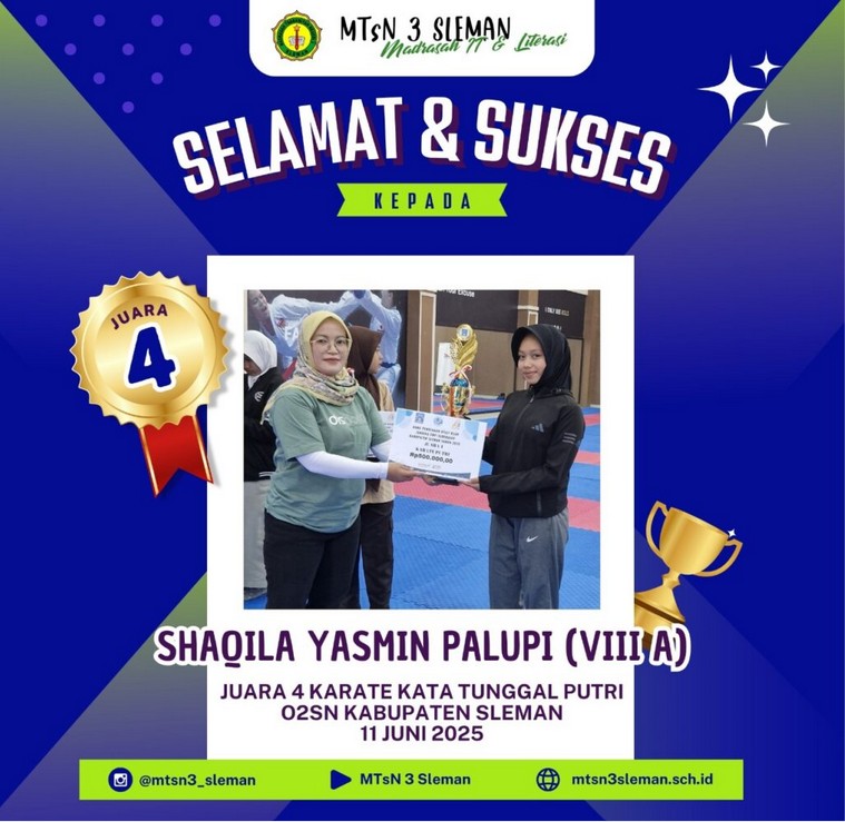 Sleman (MTsN 3 Sleman)_ Dalam Kejuaraan O2SN Kabupaten Sleman 2025 yang berlangsung di BPMP DIY pada Rabu (11/2025) Shaqila Yasmin Palupi kelas 8B mampu menyabet Juara 4 Karate Kata Tunggal Puteri O2SN tahun ini. Ia mampu menyabet medali tersebut berkat kerja keras, berlatih secara rutin serta bisa membagi waktu dengan baik sehingga dapat bertanding dan berusaha semaksimal mungkin untuk memperoleh medali. Walaupun demikian ia harus mengakui keunggulan lawan mainnya dan harus puas diurutan ketiga.