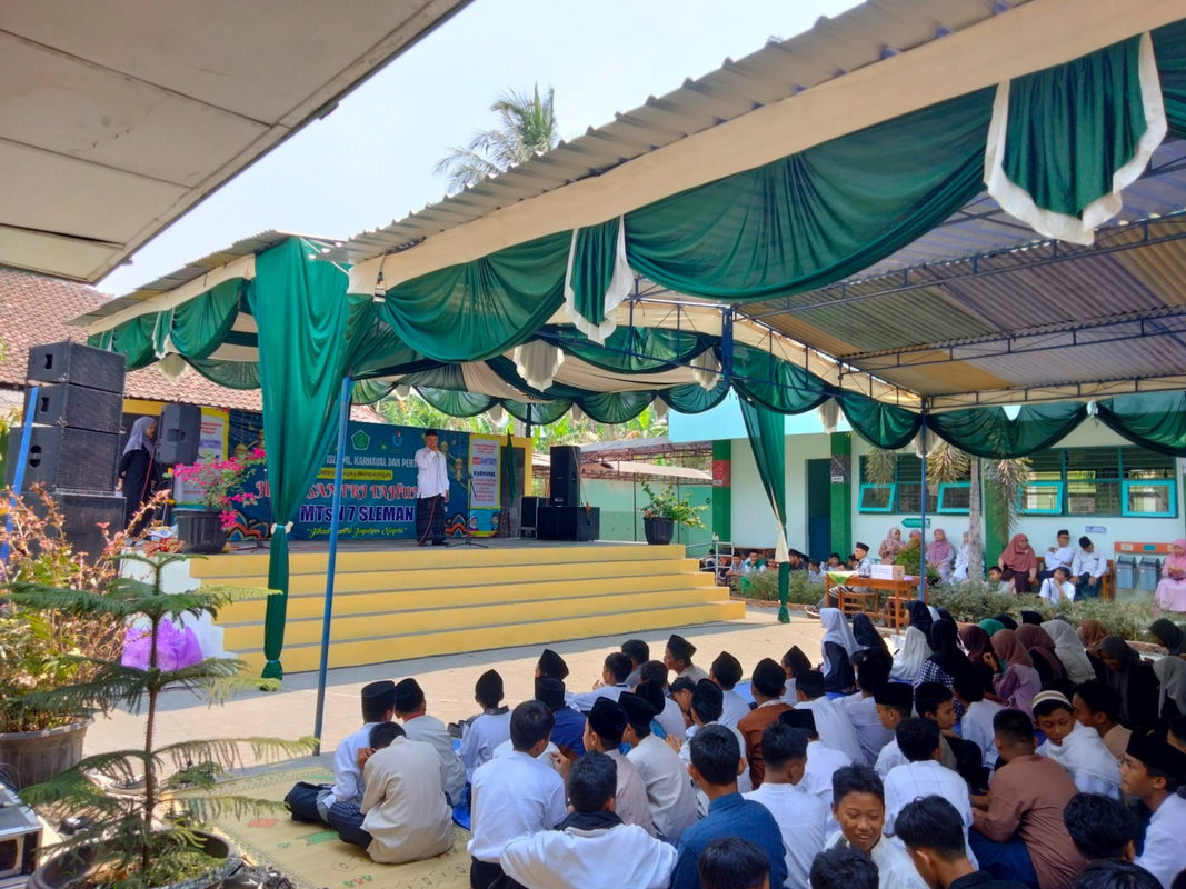 Sleman (MTsN 7 Sleman) – Puncak peringatan Hari Santri 2023 MTsN 7 Sleman dimeriahkan dengan gelar panggung kreasi yang bertempat di halaman timur MTsN 7 Sleman, Selasa (24/10/2023). Kegiatan yang diinisiasi oleh Tim Keagamaan dibantu mahasiswa PPL UII selain untuk memeriahkan hari santri juga bertujuan sebagai wadah pengembangan potensi bagi peserta didik. Kegiatan diawali dengan pawai ta’aruf keliling dusun sekitar madrasah yang dilepas oleh Kepala MTsN 7 Sleman Samsul Arifin, S.Ag.