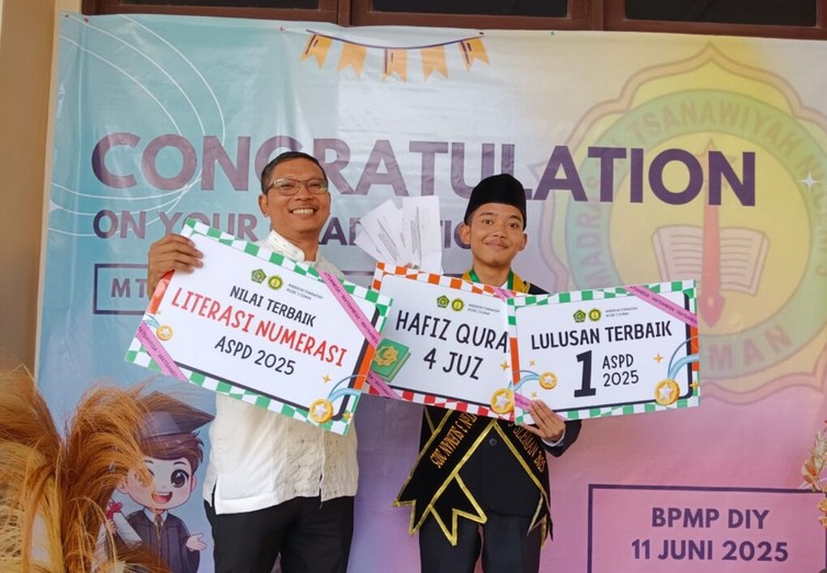Kemenag Sleman News (MTsN 3 Sleman)_ Rabu, 11/6/2025, Rafel Bintang Ghifari menuai decak kagum dan apresiasi dari audien acara Penyerahan Kembali Siswa Kelas IX Tahun Ajaran 2024-2025 MTsN 3 Sleman. Menjadi salah satu agenda rutin, MTsN 3 Sleman menganugerahkan berbagai kategori penghargaan bagi kelas IX yang diserahterimakan kepada walinya kembali. Pada tahun ini, bertempat di Aula Balai Penjaminan Mutu Pendidikan (BPMP) D.I.Yogyakarta MTsN 3 Sleman menganugerahkan lima kategori penghargaan dimana empat kategori berhasil diraih oleh Rafel.