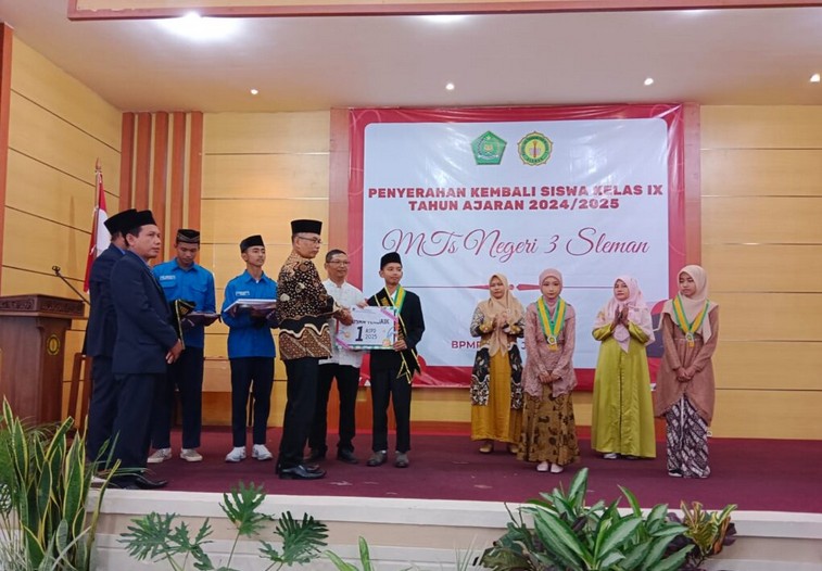 Kemenag Sleman News (MTsN 3 Sleman)_ Menjadi salah satu agenda rutin, MTsN 3 Sleman menganugerahkan berbagai kategori penghargaan bagi kelas IX sebagai apresiasi kiprahnya selama menempuh pendidikan. Penghargaan tersebut biasanya menjadi salah satu bagian dari rangkaian acara penyerahan kembali siswa kelas IX. Rabu, 11/6/2025, acara Penyerahan kembali Siswa Kelas IX Tahun Ajaran 2024-2025. Bertempat di Aula Balai Penjaminan Mutu Pendidikan (BPMP) D.I.Yogyakarta Jl. Tirtomartani, Karang Nongko, Tirtomartani, Kec. Kalasan, MTsN 3 Sleman menganugerahkan lima kategori penghargaan salah satunya adalah penghargaan bagi siswa yang meraih nilai Asesmen Standarisasi Pendidikan Daerah (ASPD) tertinggi.