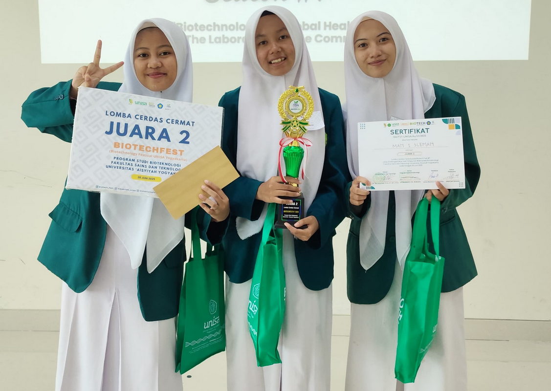 Kemenag Sleman News (MAN 1 Sleman) – Siswa MAN 1 Sleman mengukir prestasi membanggakan dengan berhasil meraih juara 2 dalam Lomba Cerdas Cermat Biotechnologi Festival Season 7 yang diselenggarakan oleh Universitas ‘Aisyiyah Yogyakarta (UNISA) pada Sabtu (28/06/2025). Pada ajang bergengsi yang mempertemukan berbagai sekolah di Yogyakarta dan sekitarnya ini, MAN 1 Sleman mengirimkan dua tim, yang masing-masing terdiri dari tiga siswa. Tim pertama berhasil meraih juara 2 setelah menampilkan penampilan luar biasa di seluruh sesi lomba.