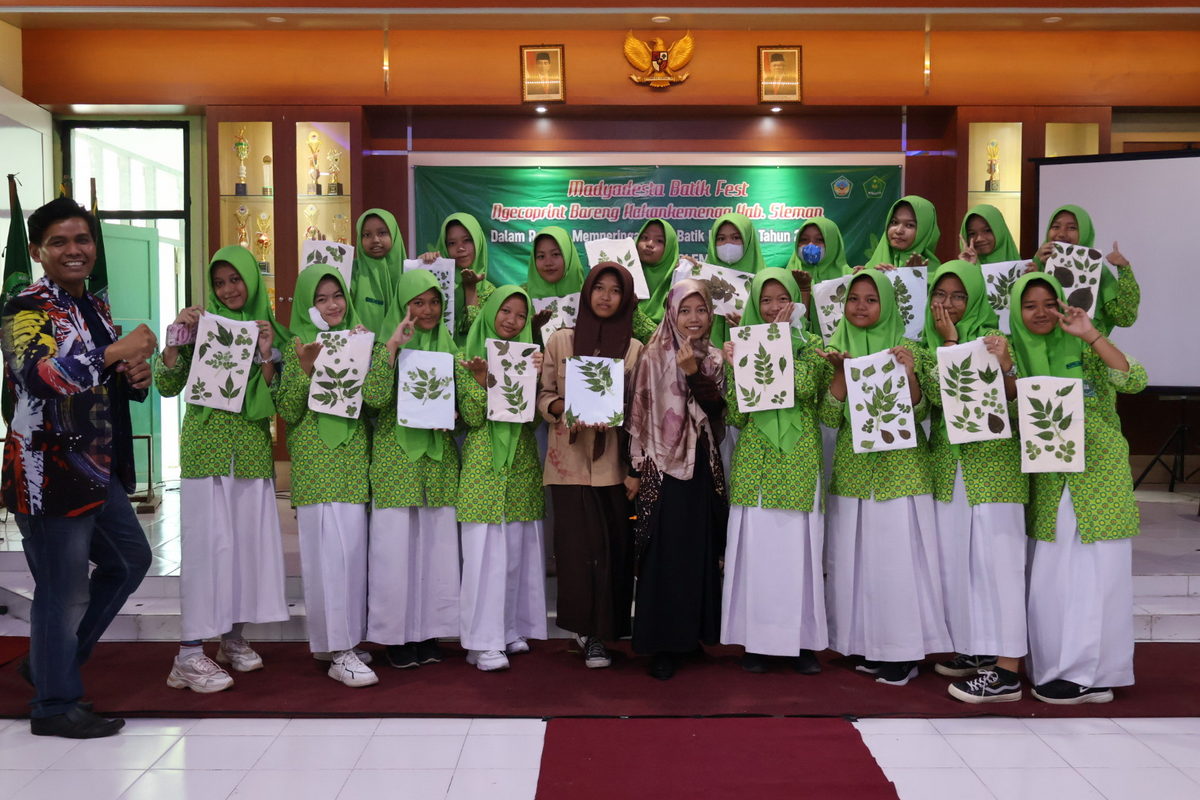 Batik Ciprat masih menjadi batik khas MTsN 8 Sleman, namun ternyata teknik pembuatan batik beragam, dan salah satunya ecoprint ini. Atas bimbingan dan arahan dari Rohmad Rapih Raharjo, S.Pd. dan Anita Dwi Astuti, S.Pd. siswa siswi, guru pegawai antusias mengikuti jalannya acara. ‘Nuthuk’ bareng, karena teknik menggunakan cara ‘menuthuk’ daun diatas selembar kain, sehingga nantinya akan menghasilkan motif dan warna yang natural. Hasilnya juga akan ramah lingkungan karena bahan bisa diambil langsung dari alam. Karena merupakan hal baru bagi siswa siswi maka mereka bersemangat untuk membuat batik dengan teknik ini, guru pegawai juga tak kalah semangatnya untuk membuat batik ecoprint. (hm8)