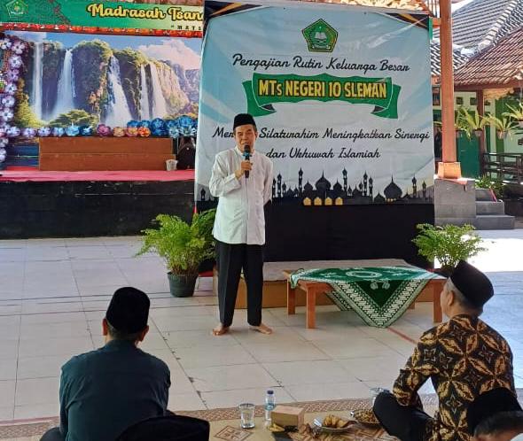 Kemenag Sleman News (MTsN 10 Sleman) – MTsN 10 Sleman kembali menggelar pengajian rutin dua bulanan yang diikuti oleh guru, pegawai, beserta anggota keluarga masing-masing, Sabtu (19/7/2025) . Bertempat di Dome MTsN 10 Sleman, pengajian berlangsung pukul 08.00 hingga 11.00 WIB . “Selain tholabul ilmi, pengajian bertujuan untuk mempererat tali silaturahmi keluarga besar madrasah,” Kepala MTsN 10 Sleman, Paijo, S.Ag., M.Pd. dalam sambutannya.